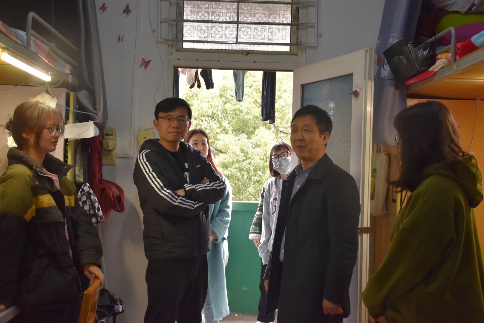 为进一步加强学生宿舍安全管理,深入了解学生思想、生活及学习情况,为新学期营造良好学习生活环境,3月1日下午,yl88858永利中国党委书记杨期勇,党委副书记张杨帆,学生管理科科长龚双双,学生教育思政科科长肖国光一行对我院学生宿舍进行走访排查。