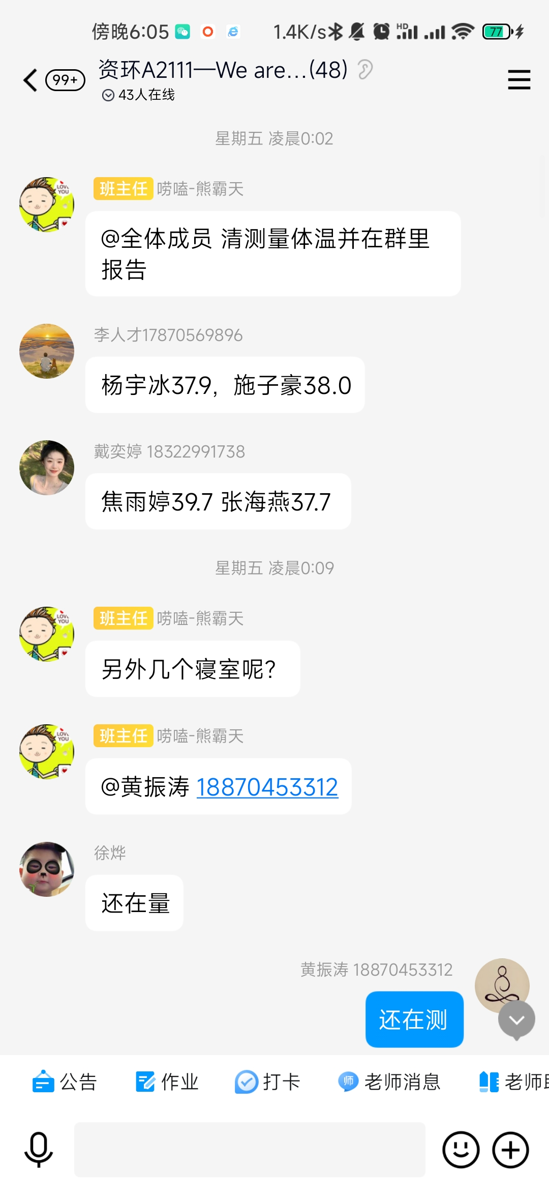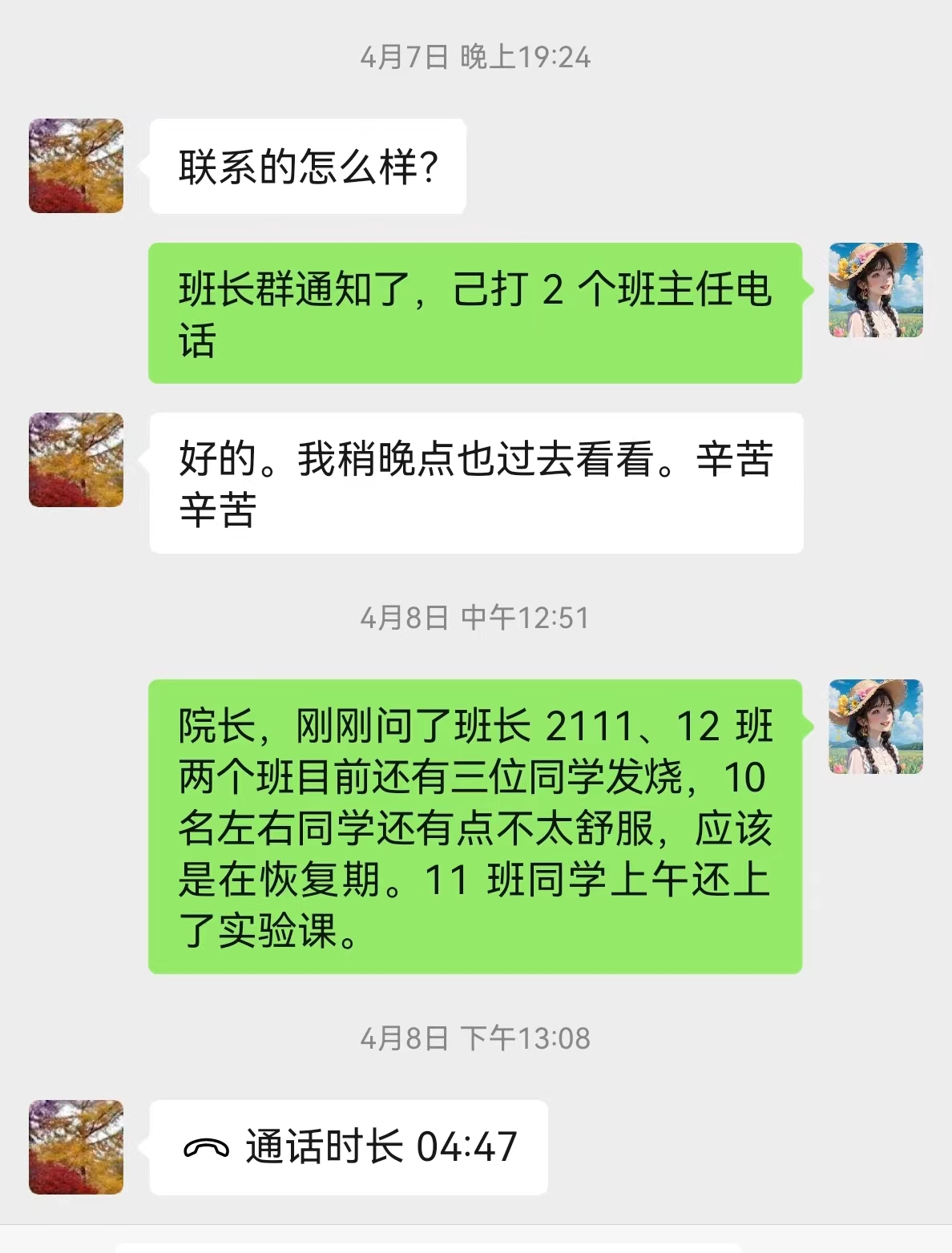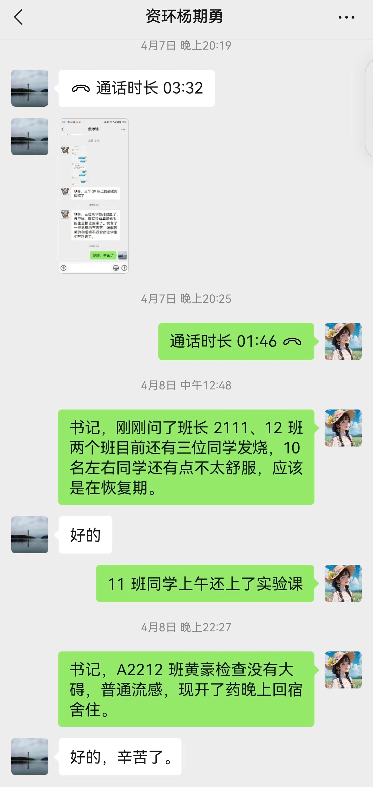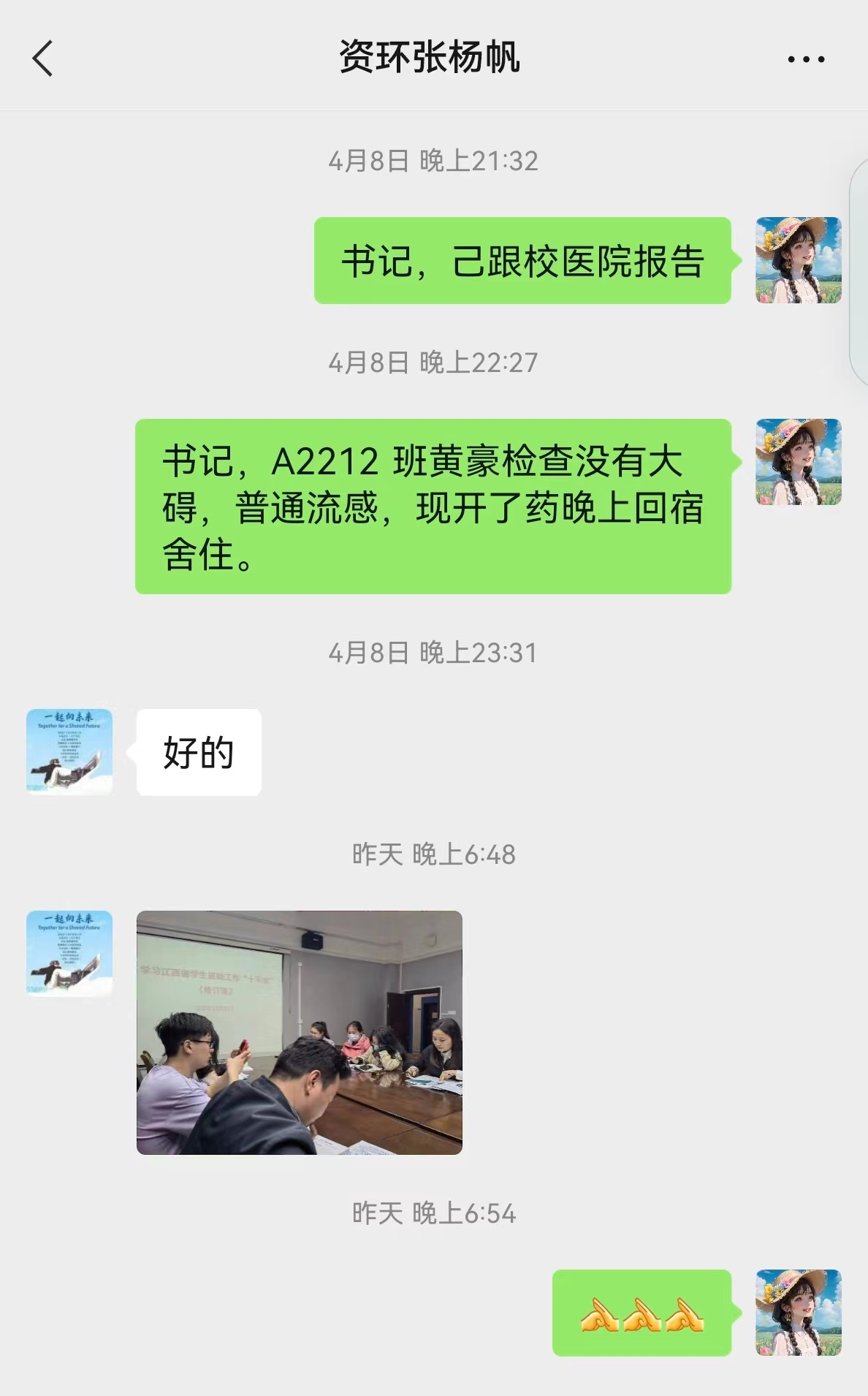 4月6日傍晚,yl88858永利中国A2111、A2112、A2212班班主任熊厚锋、黄亮、李浩然三位班主任接到班干的电话报告发现班级多名同学有感冒发烧不舒服的症状,立即赶到宿舍看望学生,带学生就医,直至凌晨。