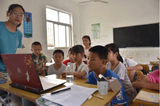 (带队老师向校长了解小学的基本情况,队员给学生推广普通话)