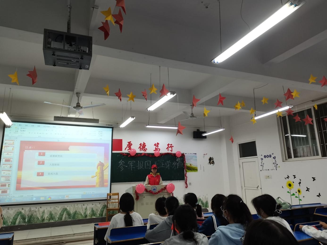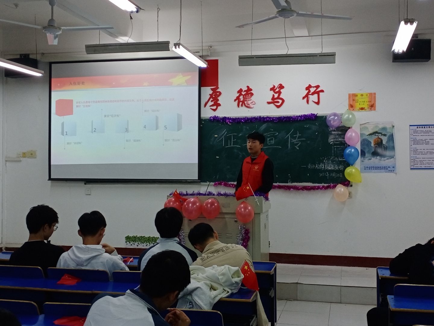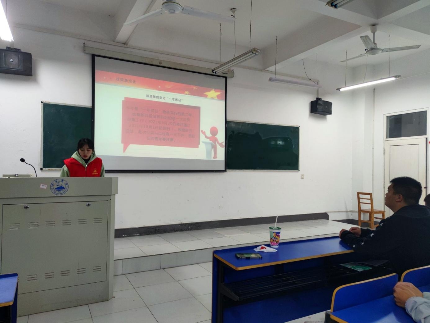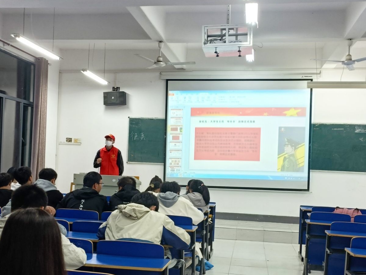 活动过程中,志愿者们向我院同学宣传应征入征义务兵政策,以ppt形式讲解国家征兵政策新变化——“一年两征”政策,并从个人前途,政治地位,国家优惠政策,提高身体素质,丰富人生阅历五个方面总结入伍益处。最后向同学们普及介绍征兵入伍的报名流程以及为有参军意愿的同学提供相关问题咨询答疑。