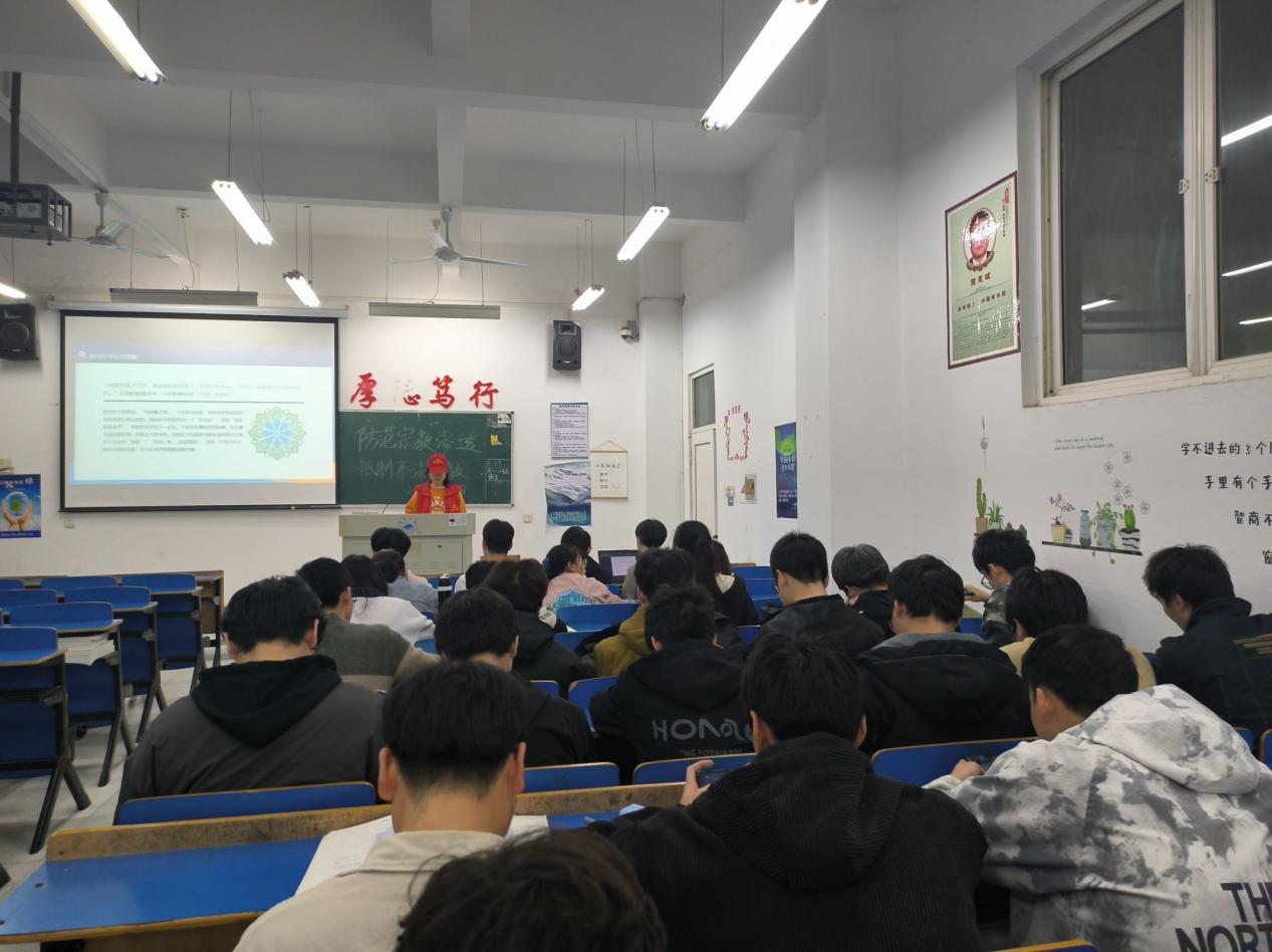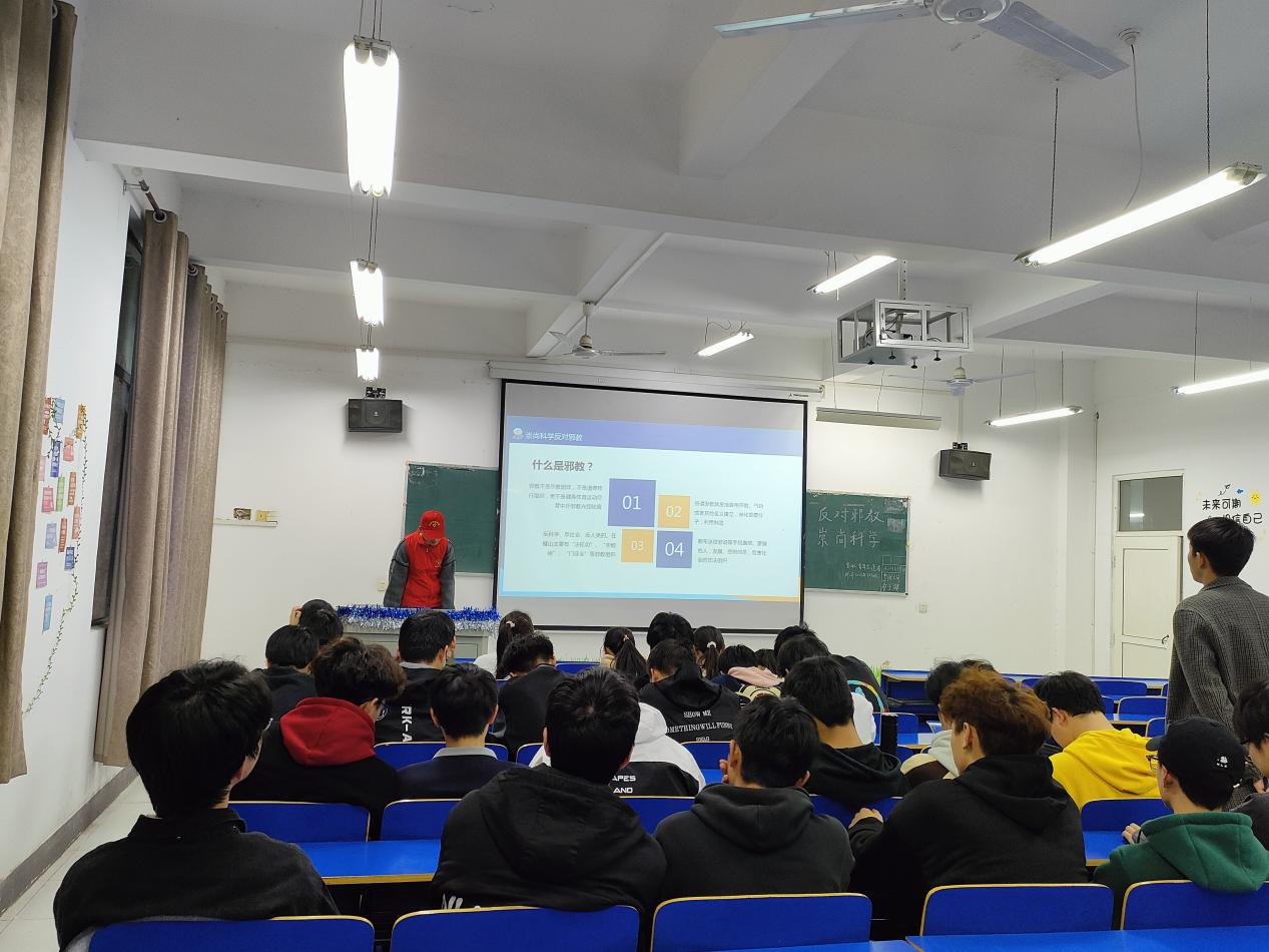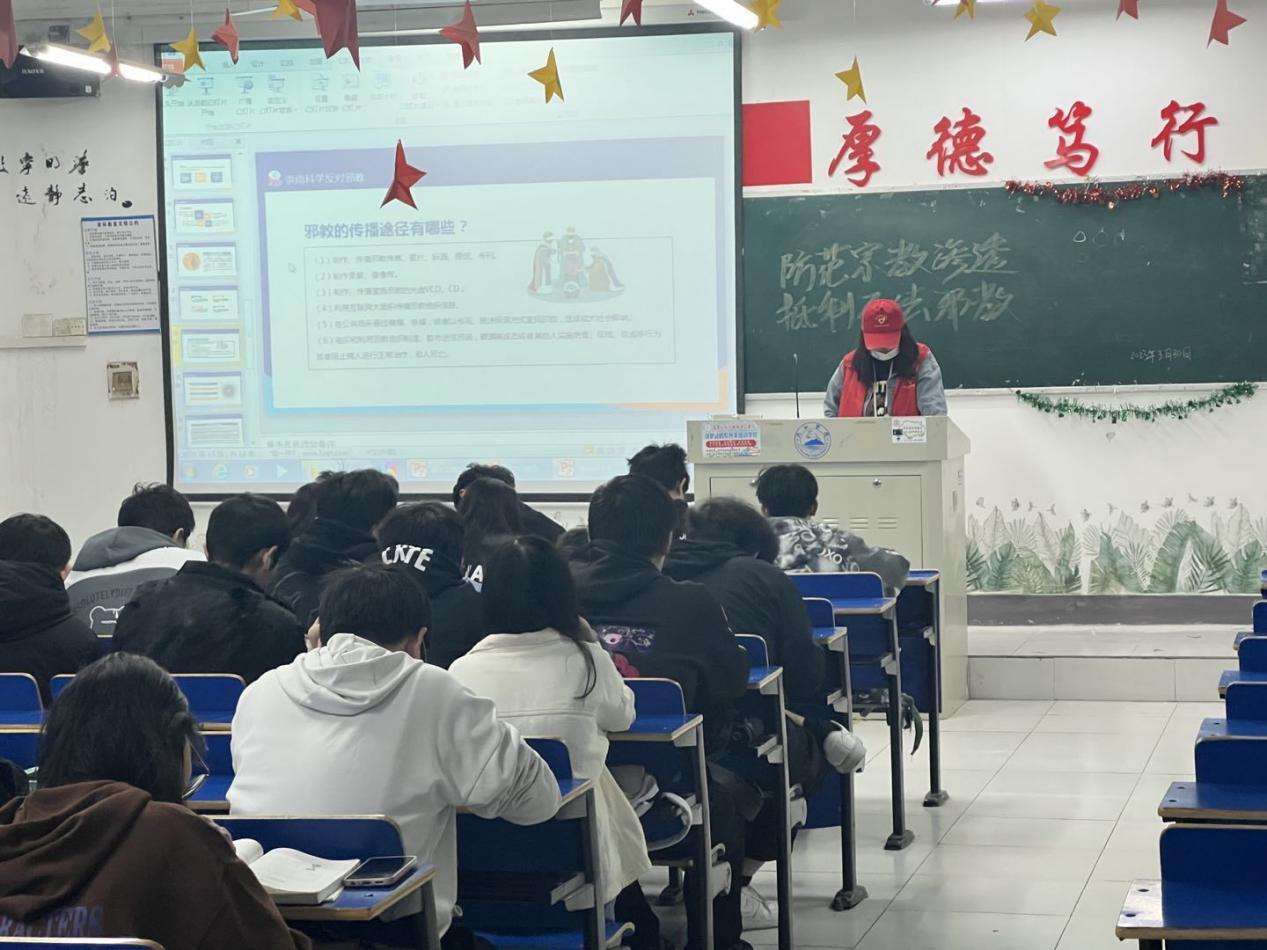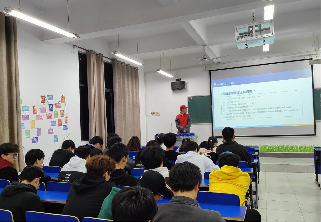在活动过程中,志愿者们分组到学院各班以PPT口头叙述的方式进行“防范宗教渗透,抵制不法邪教”安全教育宣讲,详细讲述了宗教与邪教的区别、邪教的种类、危害及防范方法等反邪教知识。