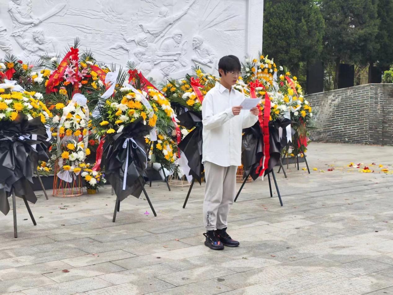 学生代表余弦为祭扫仪式献词、朗诵,号召同学们继承先烈遗志,克服困难,迎难而上,争做时代好青年!一个有希望的民族不能没有英雄,一个有前途的国家不能没有先锋,对一切为国家、为民族、为和平付出宝贵生命的人们,不管时代怎样变化我们都要永远铭记他们的牺牲和奉献,家国清明之际,共寄振风哀思。