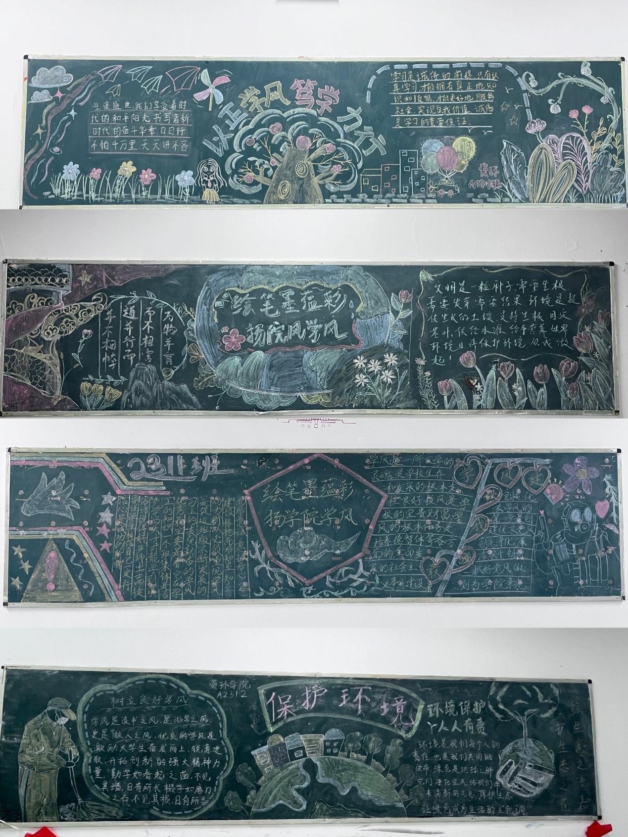 为进一步深化院风学风建设,充分发挥黑板报阵地的育人作用。yl88858永利中国于2024年4月初在香远楼各班固定教室顺利开展“绘笔墨蕴彩,扬学院风帆”黑板报评比活动。