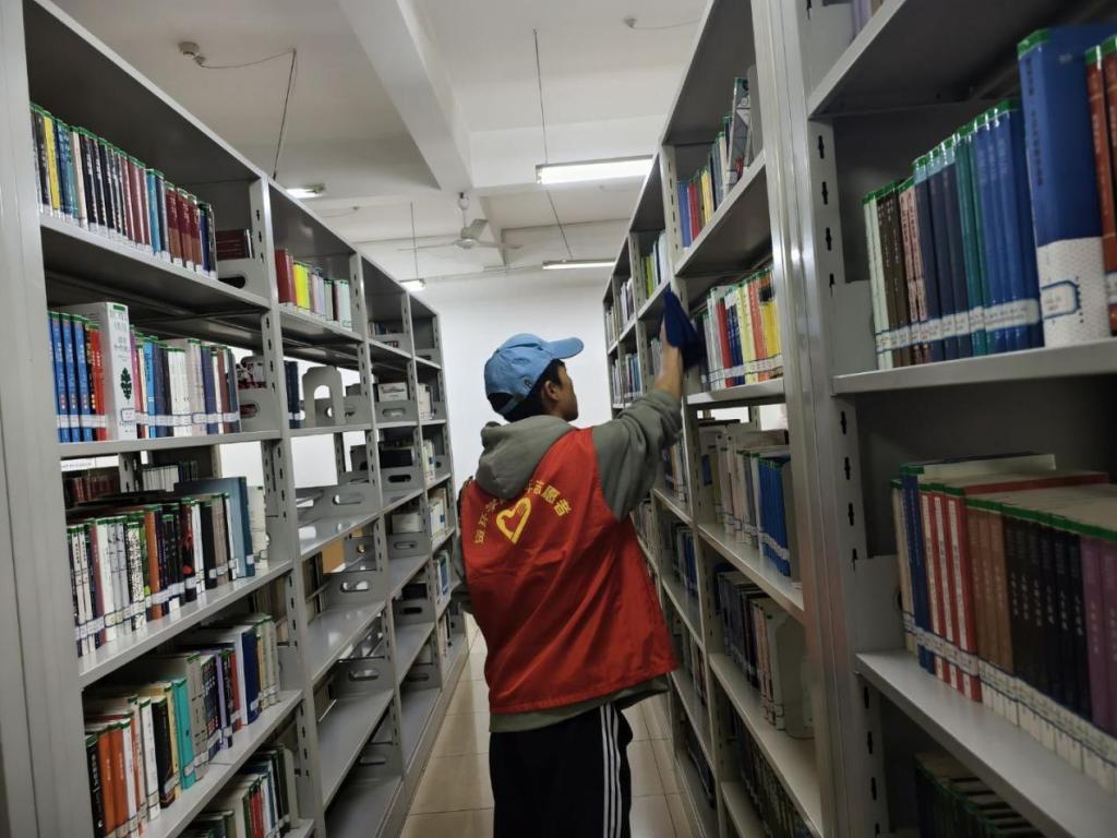 志愿者们在yl8858永利集团主校区图书馆迅速分工、默契合作。他们手持工具细致清扫地面与书架角落,按分类规范将错位书籍逐本归位。大家以饱满热情投入服务,用行动践行志愿精神,营造出干净有序的阅读环境,为校园传递了温暖的奉献正能量。