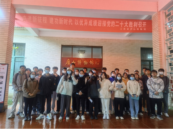 而位于芦林湖畔、九奇峰下的庐山博物馆更是让同学们对九江地域文化有了更深的认识和理解。雨后的庐山云雾缭绕、水汽氤氲,伴有些许寒意,但丝毫没有冷却同学们的热情。品读着文人李白、苏轼、白居易等学者描写庐山的经典诗词,感受到古代先贤对于山水自然的喜爱和赞扬。而王阳明先生“万物一体”思想则让同学们进一步体会到了古代先贤蕴含的习近平生态文明思想。博物馆昏黄的灯光下,珍贵的老旧照片、毛笔写就的字体,把同学们带回到那个往昔的英雄岁月,同学们不禁感叹这名山所承载深厚的历史文化底蕴,同时也更加明白了今日生活的来之不易,表示将承先辈遗志、明专业知识、怀远大理想、谱未来新篇。