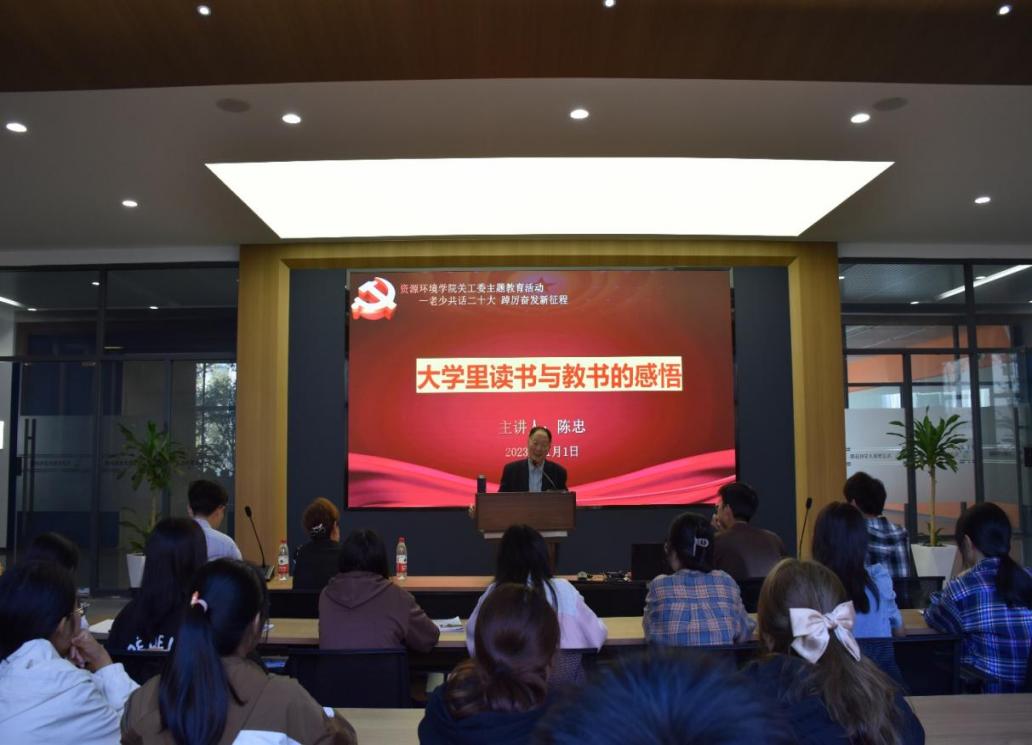 为深入学习领悟党的二十大精神,切实贯彻落实《关于加强新时代关心下一代工作委员会工作的意见》文件要求,11月1日下午,yl88858永利中国在厚德楼一楼研讨室组织开展“老少共话二十大,踔厉奋发新征程”主题教育活动。活动特邀全国优秀老师、江西省关心下一代工作委员会报告团成员、yl8858永利集团退休教授陈忠主讲,yl8858永利集团关心下一代工作委员会委员龚胜红出席,2023级学生及教师代表近百人参加了本次活动,活动由学院党委副书记张杨帆主持。