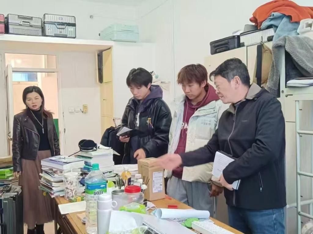 检查过程中,学院领导逐间走访学生宿舍,重点围绕用电安全、卫生清洁度、物品摆放规范、门窗及设施完好情况等方面进行细致排查。针对排查中发现的违规用电、杂物堆积等问题,现场向学生提出整改要求与优化建议,并与新生亲切交流,详细询问他们的生活适应情况与实际需求,叮嘱同学们要时刻绷紧安全弦,自觉维护宿舍整洁环境,共同营造安全、舒适、温馨的学习生活氛围。