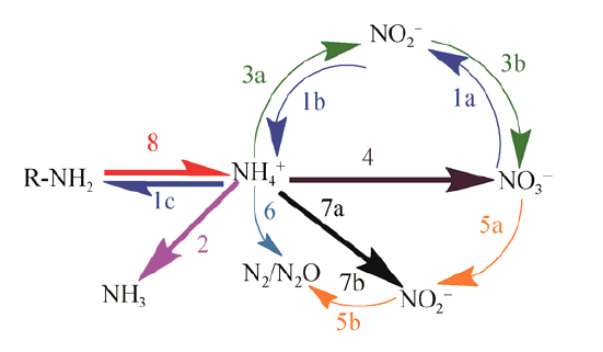 菌藻协同体系对无机氮的去除机理主要涉及同化作用[3]。氧化态氮的同化如NO3或NO2首先还原为NH4+态,然后进一步融入氨基酸,而还原态氮(NH4+)可以被微藻直接同化。具体来说,硝酸盐还原酶利用烟酰胺腺嘌呤二核苷酸(NADH)的还原形式传递两个电子,使硝酸盐转化为亚硝酸盐。然后亚硝酸盐被亚硝酸还原酶转化成铵,使用铁氧还蛋白(Fd)作为电子供体。因此,所有形式的无机氮最终都转化为铵,然后利用谷氨酸和ATP 将铵结合到氨基酸中。除同化作用外,氨挥发作用、硝化作用和反硝化作用也是无机氮去除过程中的关键机理。